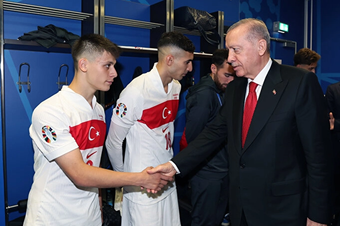 Almanya'nın başkenti Berlin'de gerçekleşen 2024 Avrupa Futbol Şampiyonası (EURO 2024) çeyrek finalinde Türkiye ile Hollanda arasındaki müsabakanın heyecanı bitiminde, Cumhurbaşkanı Recep Tayyip Erdoğan, milli futbolcuları tebrik etmek üzere soyunma odasına indi. Erdoğan, Berlin Olimpiyat Stadyumu'nda takip ettiği maç sonrası futbolcularla bir araya gelerek başarılar diledi ve moral verdi.