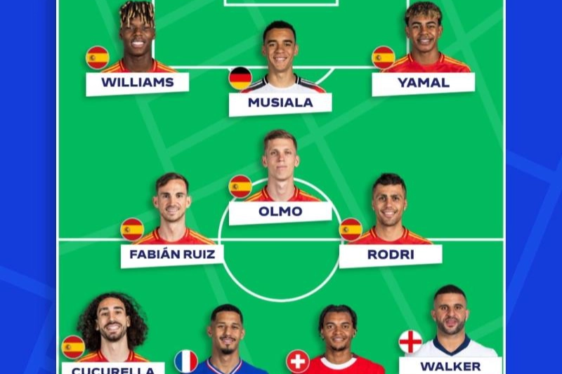 Almanya'nın ev sahipliğinde gerçekleştirilen 2024 Avrupa Futbol Şampiyonası'nda (EURO 2024) turnuvanın takımı belli oldu. UEFA, EURO 2024'teki teknik gözlemcilerin oylarıyla belirlenen EURO 2024'ün en iyi 11'ini açıkladı. Listede organizasyonu şampiyonlukla noktalayan İspanya'dan 6, yarı finalde şampiyonaya veda eden Fransa'dan 2, finalist İngiltere'den, turnuvanın sürpriz takımı İsviçre'den ve ev sahibi Almanya'dan da 1'er oyuncu yer aldı.