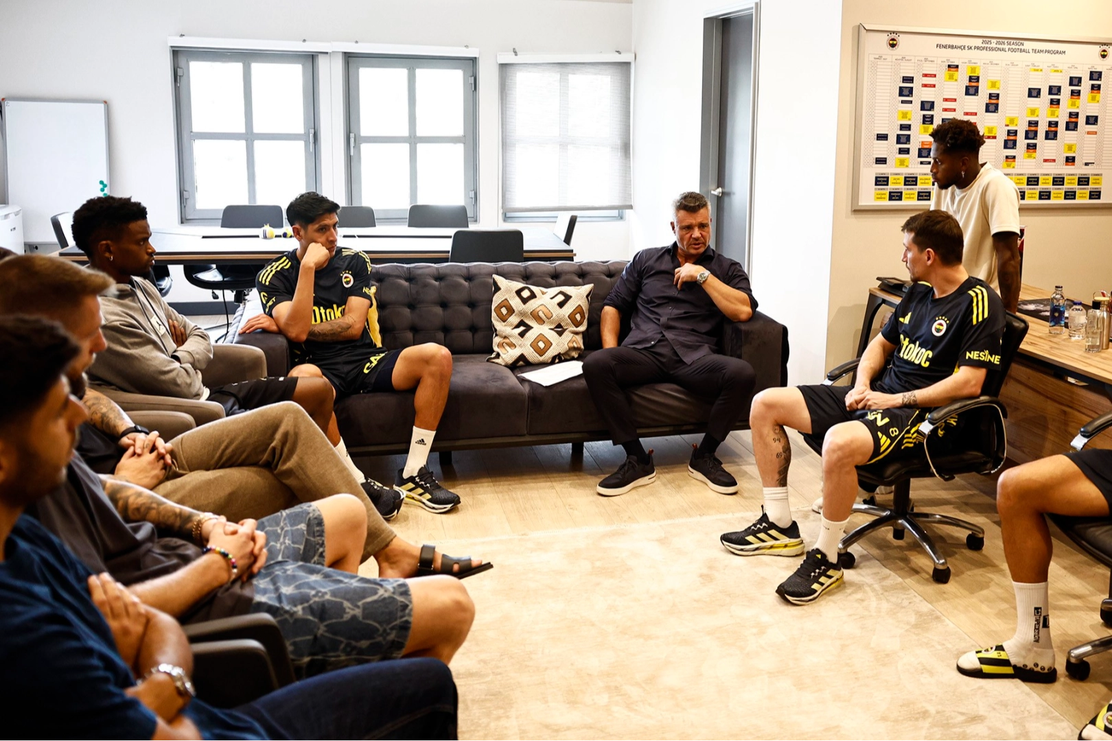 Fenerbahçe Başkanı Sadettin Saran ve Yönetim Kurulu Üyesi Ertan Torunoğulları, Fenerbahçe Can Bartu Tesisleri’nde A takım futbolcularıyla bir araya geldi.