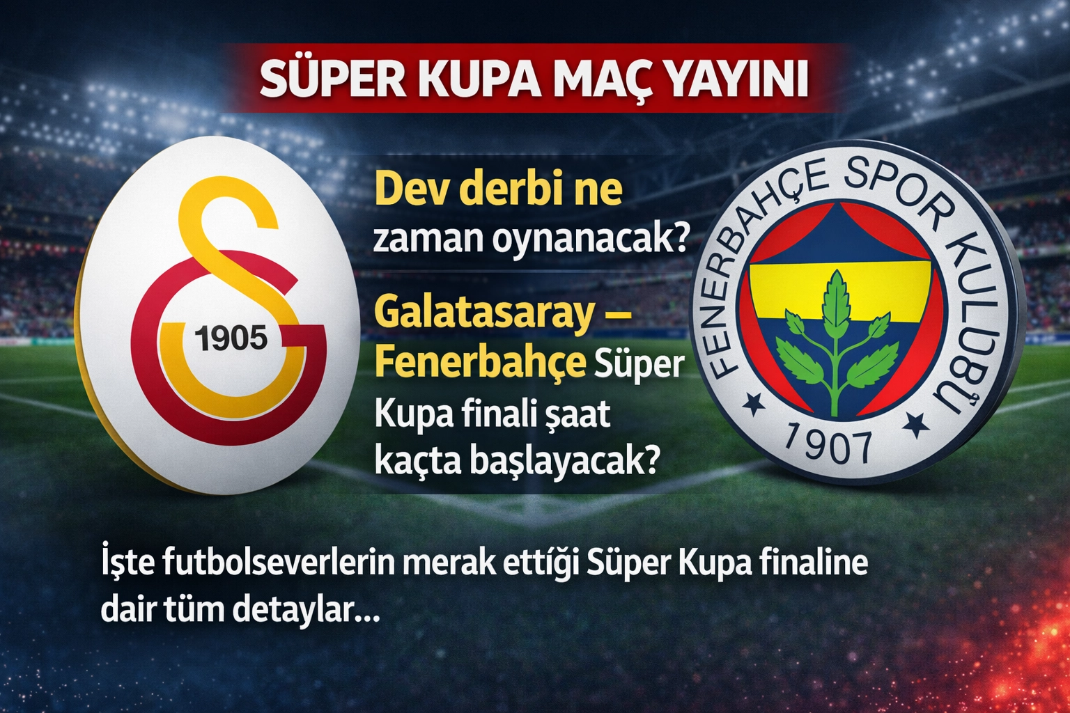 Turkcell Süper Kupa finalinde Galatasaray ile Fenerbahçe karşı karşıya geliyor. Yarı finalde Samsunspor’u 2-0 mağlup eden Fenerbahçe’nin finale yükselmesiyle birlikte, futbolseverlerin gözü dev derbiye çevrildi. Sezonun ilk kupasının sahibini belirleyecek karşılaşma öncesinde “Süper Kupa maçı ne zaman, saat kaçta, hangi kanalda?” soruları yoğun şekilde araştırılıyor. İşte Galatasaray–Fenerbahçe Süper Kupa finaline dair tüm detaylar…