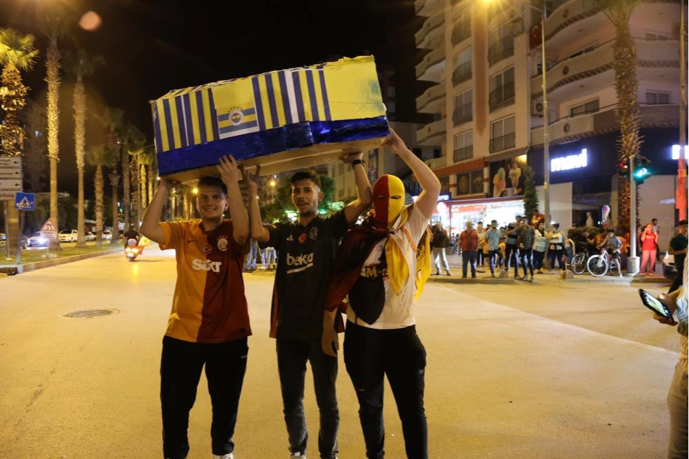Şampiyonluğunu ilan eden Galatasaray’ın Adana Kozan'daki bazı taraftarları, Fenerbahçe bayrağını tabuta sararak davul zurna ile kutlama yaptı.Yurt genelinde olduğu gibi Adana Kozan'da Galatasaray taraftarları şampiyonluk kutlamaları için meydana çıktı. Kutlama yapan taraftarlardan bazıları ise Fenerbahçe'ye gönderme yaptı. Fenerbahçe bayrağını tabuta saran bazı genç taraftarlar dikkat çekti. Taraftarların araçlarla, davul zurna eşliğinde kutlama yapmaları da renkli görüntüler oluşturdu. Taraftarlardan Oğuzhan Özbay 11 yıldır Fenerbahçe şampiyon olamayınca gençlerin böyle bir seremoni hazırladığını söyledi.