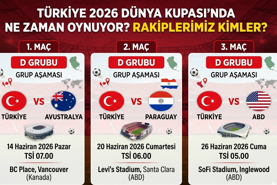 2026 FIFA Dünya Kupası için geri sayım sürüyor. A Milli Futbol Takımı, Avrupa Elemeleri play-off finalinde Kosova’yı 1-0 yenerek 24 yıl aradan sonra Dünya Kupası’na katılma hakkı kazandı. Milliler, turnuvada D Grubu’nda ABD, Paraguay ve Avustralya ile mücadele edecek. Türkiye, tarihinde üçüncü kez Dünya Kupası sahnesinde boy gösterecek. Peki, Türkiye milli maçları ne zaman, saat kaçta ve hangi stadyumlarda oynanacak?