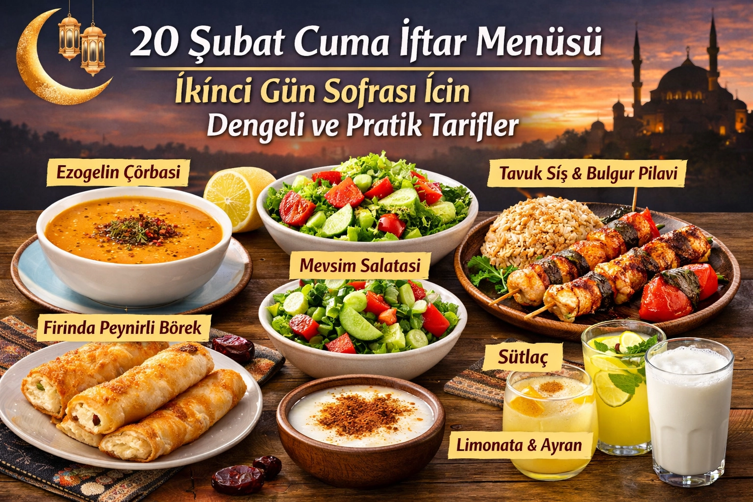 20 Şubat Cuma iftar menüsü, Ramazan sofralarında hem pratik hem de dengeli seçenekler arayan vatandaşların gündeminde yer alıyor. Gün boyu süren orucun ardından mideyi yormayan, besleyici ve doyurucu yemeklerden oluşan bir menü hazırlamak isteyenler için çorbadan ana yemeğe, salatadan tatlıya kadar uyumlu lezzet önerileri öne çıkıyor. İşte 20 Şubat Cuma günü için sofralarınıza ilham verecek iftar menüsü detayları…