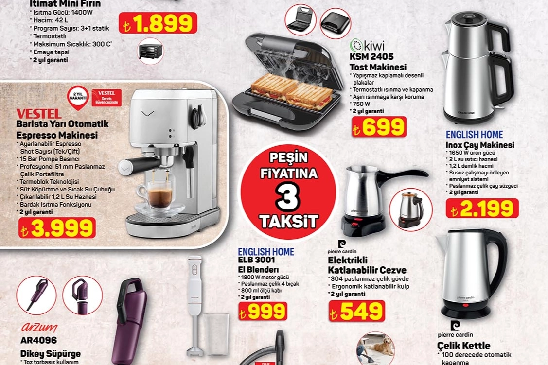 A101’in yeni aktüel kataloğunda bu hafta dikkat çeken ürünler arasında mini fırın 1.899 TL, barista yarı otomatik espresso makinesi 3.999 TL ve halı/koltuk yıkama makinesi 3.799 TL yer alıyor. Ayrıca APX7 200 cc benzinli motosiklet 99.990 TL, oyuncak pilli süpürge 429 TL ve otomatik kendini temizleyen kedi tuvaleti 9.999 TL ile satışa çıkacak.