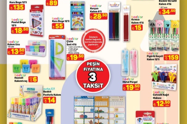 28 Ağustos A101 aktüel kataloğunda defter, kalem, silgi, kalem kutusu, okul çantası, kutu boyalar gibi kırtasiye malzemeleri öne çıkıyor. Yeni eğitim öğretim yılı öncesinde veliler, öğrencilerin ihtiyaçlarını bu ürünlerle karşılayabilecek.