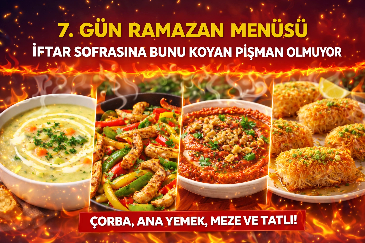 RAMAZANRamazan’ın 7. günü için hazırlanan iftar menüsünde çorba, ana yemek, meze ve tatlıdan oluşan dengeli bir liste yer alıyor. İşte 7. gün Ramazan menüsünün tarifleri…