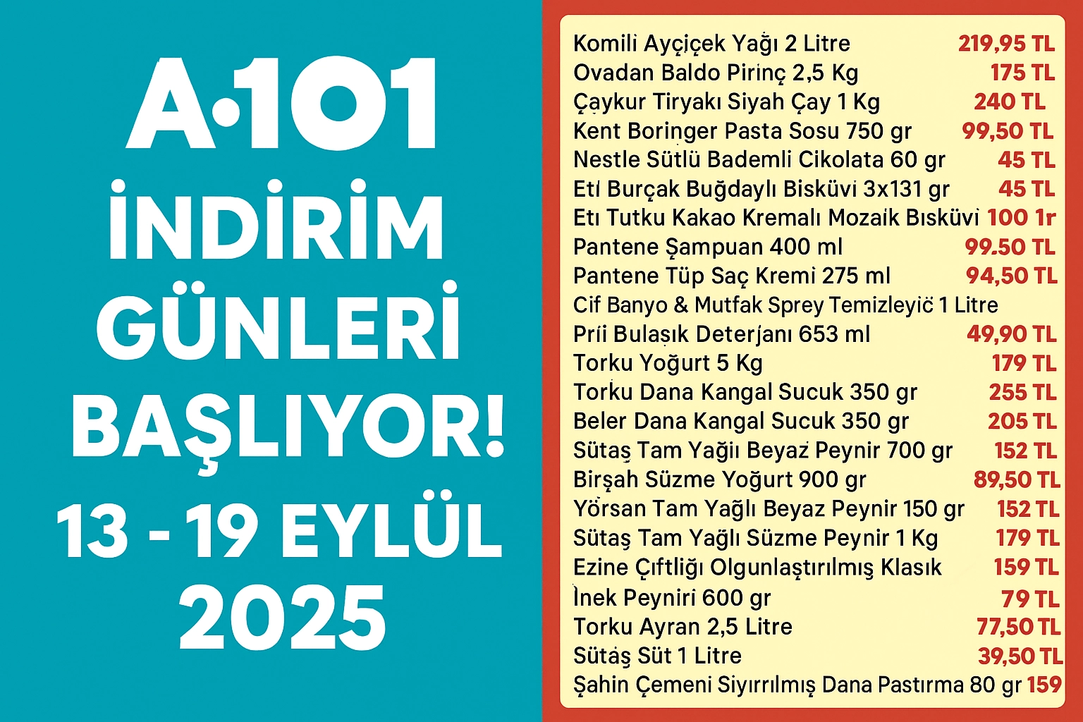 Türkiye’nin önde gelen perakende zincirlerinden A101, 13 - 19 Eylül 2025 tarihleri arasında geçerli olacak aktüel ürün kataloglarını yayınladı. Haftanın fırsatları arasında gıda, temizlik ve kişisel bakım ürünleri yer alıyor. Komili Ayçiçek Yağı, Çaykur Tiryaki Siyah Çay, Torku yoğurt ve sucuk çeşitleri, Sütaş ve Yörsan peynir ürünleri, Nestle çikolata ve Eti bisküvi gibi ürünler indirimli fiyatlarıyla öne çıkıyor .A101, haftalık aktüel ürün kataloğunu açıkladı. 13 - 19 Eylül 2025 tarihleri arasında marketlerde indirimli ürünleri uygun fiyatlarla bulabilirsiniz. İşte öne çıkan fırsatlar...