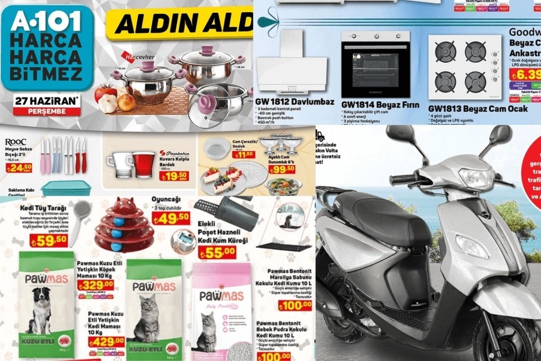 A101, her hafta Perşembe günü satışa sunduğu indirimli ürünler kataloğuyla yine dikkat çekiyor. 27 Haziran itibariyle mağazalarda yerini alacak ürünler arasında benzinli motosiklet, çelik çay makinesi, kablosuz hoparlör, gaming kulaklık, 6 parça tencere seti ve daha birçok ürün bulunuyor. İşte A101’in Haziran ayının son Aldın Aldın kataloğunda yer alan indirimli ürünler: