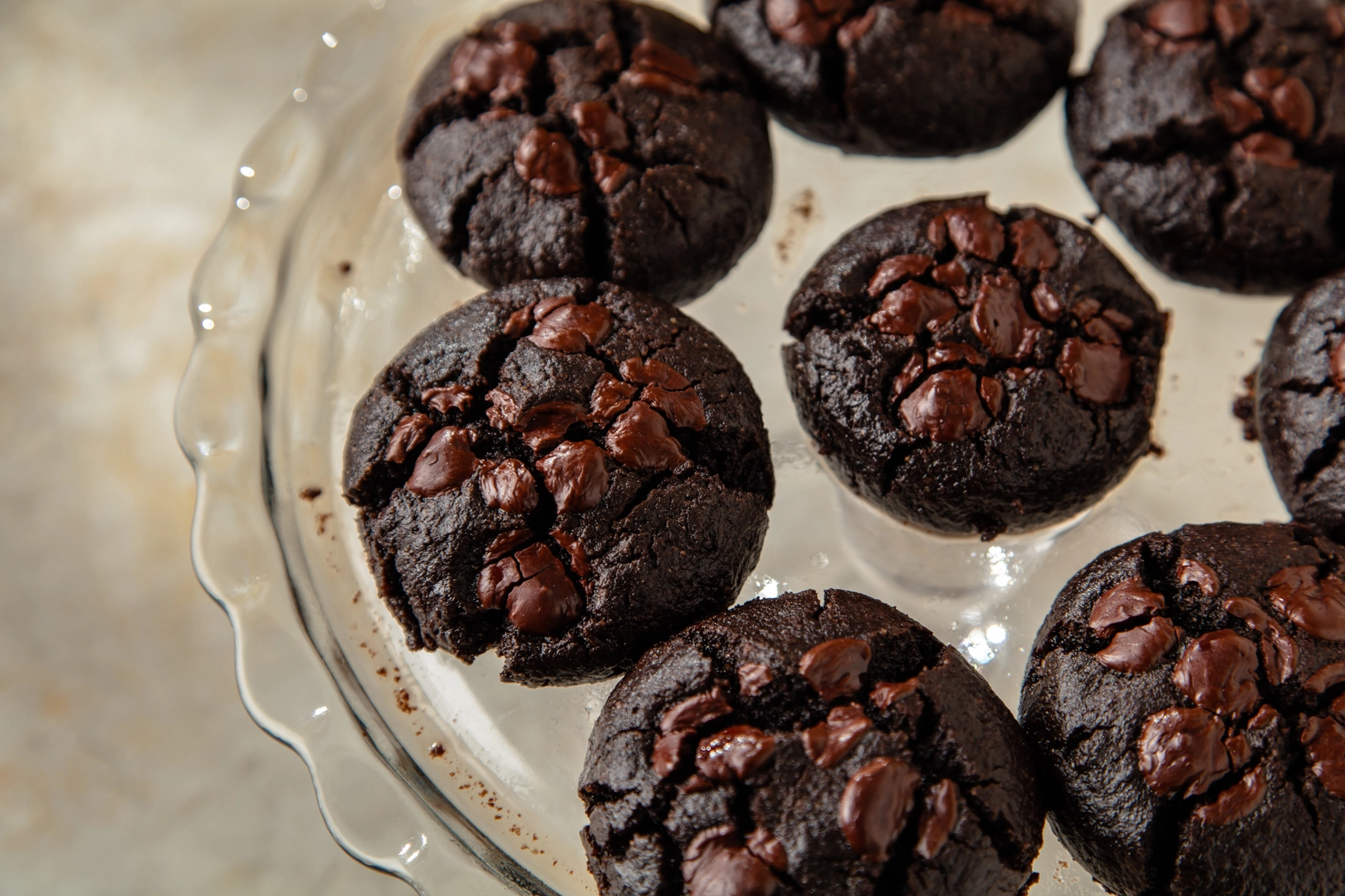 Hamur toplarını cam fırın tepsisine dizin. Her birinin ortasına birer damla çikolata yerleştirip hafifçe bastırarak şekil verin.
