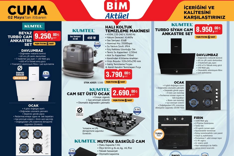 Mayıs ayının ilk Cuma günü BİM rafları kamp severler, mutfak alışverişi yapanlar ve teknoloji tutkunları için dolup taşıyor. 2 Mayıs 2025 Cuma günü itibarıyla geçerli olacak BİM aktüel ürünler kataloğu açıklandı. Kamp çadırı, kamp ekipmanları, TCL televizyonlar, elektrikli bisikletler, motosikletler, mutfak ürünleri ve ev eşyaları dikkat çekiyor. İşte BİM 2 Mayıs 2025 Cuma günü indirime girecek ürünlerin tam listesi…