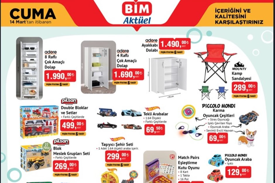 BİM, her hafta Salı ve Cuma günlerine özel hazırladığı aktüel kataloglarla, farklı ürün seçeneklerini müşterilerine sunmaya devam ediyor. 11-14 Mart tarihleri arasında mağaza raflarında yer alacak yeni ürünler arasında günlük ihtiyaçlardan teknoloji ürünlerine kadar geniş bir yelpaze bulunuyor.