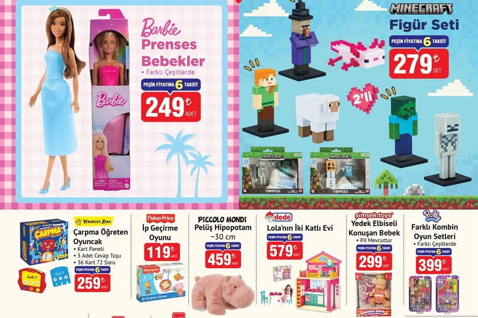 Prenses Bebek: 249 TL, Minecraft Figür Seti: 279 TL, Oyuncak Tamir Seti: 165 TL, Mini Org: 149 TL