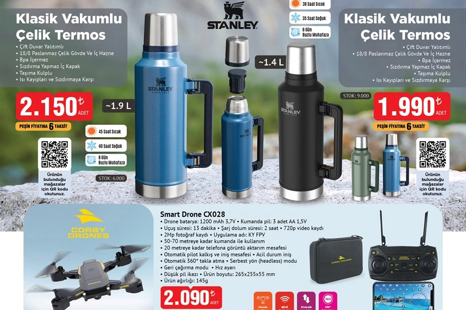Merakla beklenen BİM 15 Ağustos 2025 aktüel kataloğu, Cuma günü itibarıyla satışa sunuldu. Bu hafta katalogda, ev aletlerinden teknoloji ürünlerine, mutfak gereçlerinden yazlık ürünlere kadar birçok seçenek yer alıyor. Özellikle Stanley Vakumlu Çelik Termos ve Smart Drone, tüketicilerin radarına giren öne çıkan ürünler arasında bulunuyor. Raflarda sınırlı stoklarla yerini alan ürünler, hem mağazalardan hem de BİM online alışveriş sitesinden satın alınabiliyor.