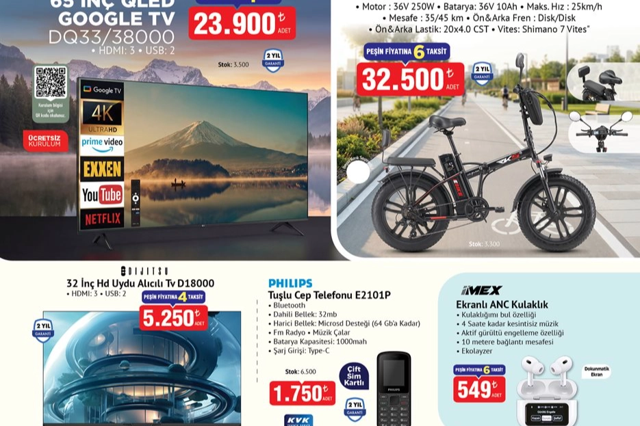 Elektronik kategorisinde öne çıkan ürünler arasında Dijitsu 65 inç QLED Google TV (23.900 TL), RKS RSIII Pro Max elektrikli bisiklet (32.500 TL) ve Philips tuşlu cep telefonu (1.750 TL) yer aldı. Ayrıca gaming kulaklık, karaoke mikrofon ve çizim tableti gibi teknolojik ürünler de tüketicilerin ilgisini çekti.