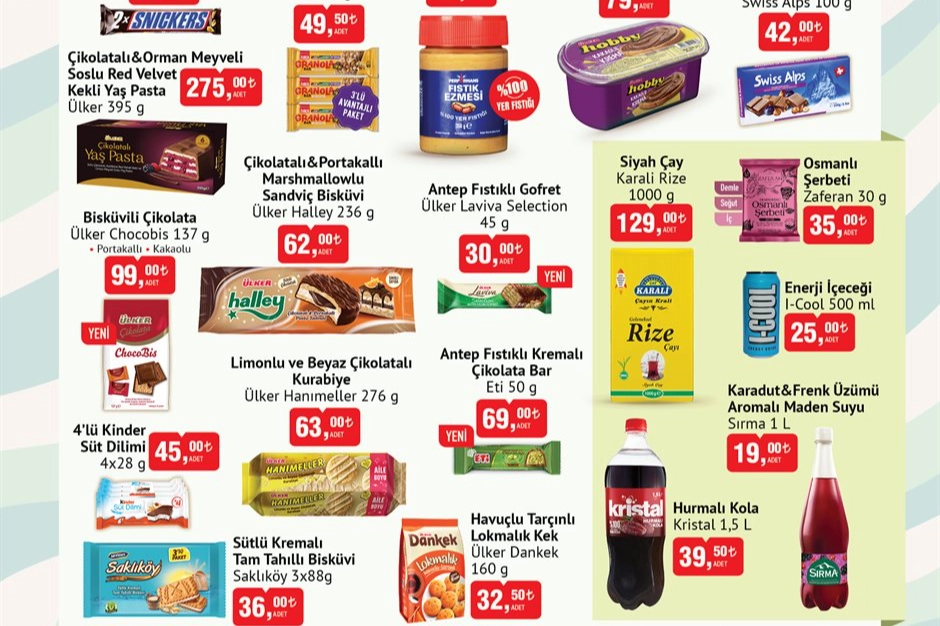 Lezzetli Atıştırmalıklar ve TatlılarTatlı severler için Ülker'in Çikolatalı & Orman Meyveli Soslu Red Velvet Kekli Yaş Pasta (395 g) 275 TL’ye sunulacak. Bunun yanı sıra, Erpiliç Piliç Kadınbudu Köfte (1000 g) 109 TL’ye alıcı bulacak.