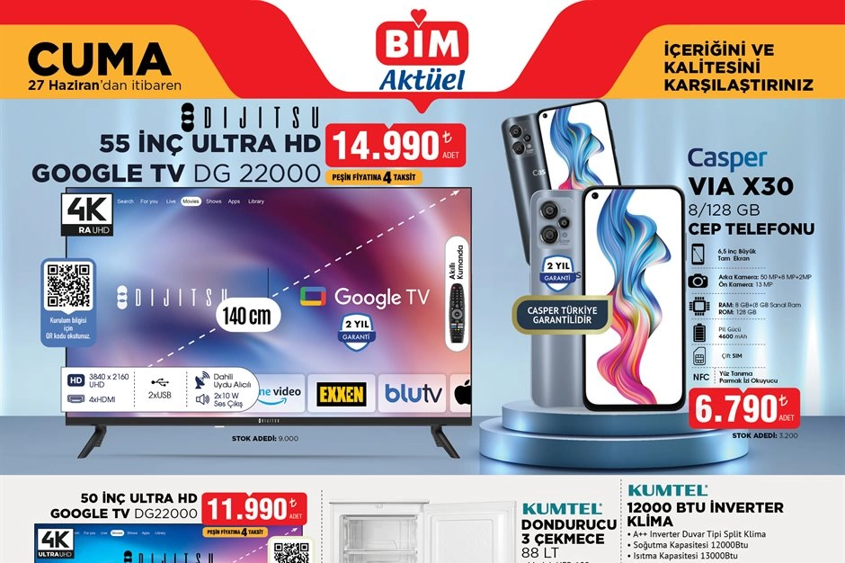 Her hafta Salı ve Cuma günleri için özel olarak hazırlanan BİM aktüel ürünler kataloğunda 27 Haziran Cuma günü raflara gelecek ürünler belli oldu. Sınırlı sayıda mağazaya dağıtılacak ürünler büyük ilgi görmeye aday.