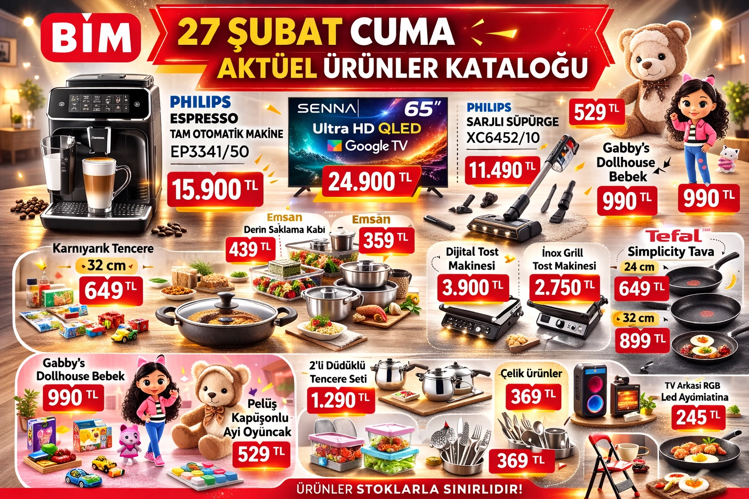 BİM 27 Şubat 2026 aktüel kataloğu alışveriş tutkunlarının gündeminde yerini aldı. Her hafta farklı kategorilerde ürünleri indirimli fiyatlarla satışa sunan BİM, bu hafta özellikle elektronik ve küçük ev aletleriyle dikkat çekiyor. Philips kahve makinesi ve şarjlı süpürge gibi yüksek fiyatlı ürünlerin yanı sıra mutfak gereçleri, tekstil ve oyuncak ürünleri de katalogda öne çıkıyor.