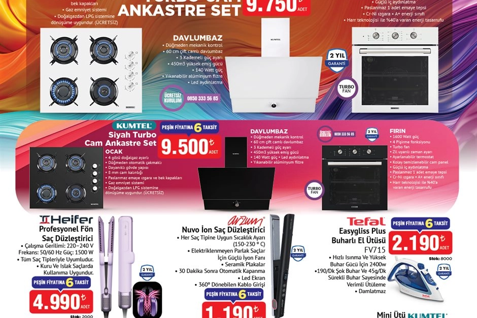 Kumtel Cam Ankastre Set: 9.500 TL Tefal Easygliss Plus Buharlı El Ütüsü: 2.190 TL Onvo Mekanik Tost Makinesi: 2.290 TL Toz Torbasız Süpürge: 4.490 TL Kumtel Cam Doğrayıcı: 1.190 TL Filtre Kahve Makinesi: 1.990 TL