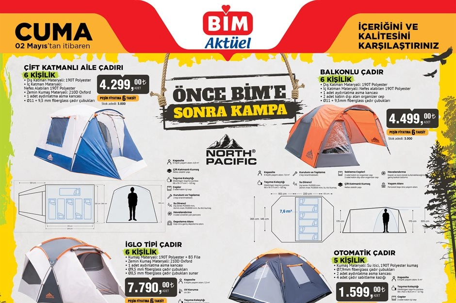 BİM, 2 Mayıs Cuma günü kamp severleri sevindirecek ürünlerle dolu aktüel ürünler kataloğunu yayımladı. 6 kişilik kamp çadırlarından otomatik çadırlara, taşınabilir tuvaletten kamp lambasına kadar birçok ürün indirime giriyor. İşte bu haftanın öne çıkan ürünleri: