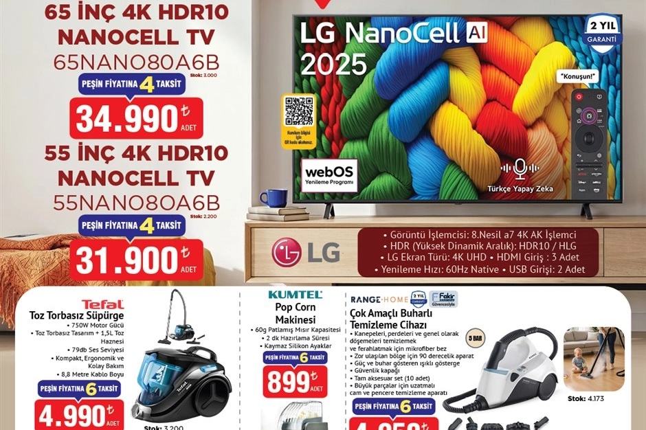 Bu haftanın en çok konuşulan ürünü ise LG 65 inç 4K HDR10 Nanocell TV (65NANO80A6B) oldu. Söz konusu televizyon, 34.990 TL fiyat etiketiyle BİM raflarında satışa sunulacak. Geniş ekran ve yüksek görüntü kalitesi arayan tüketiciler için ürünün yoğun ilgi görmesi bekleniyor.