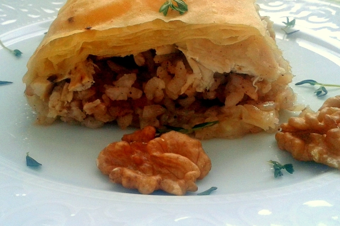 25-30 cm’lik fırın tepsisini tereyağı ile yağlayın. İlk yufkayı büzüştürerek tepsiye yerleştirin. Pişirdiğiniz pirinç pilavının yarısını yufkanın üzerine yayın. Tavuk parçalarını pilavın üstüne kaplayacak şekilde yerleştirin. Kalan pilavı ilave ederek üzerini düzleştirin. İkinci yufkayı da büzüştürüp pilavın üstüne koyun.