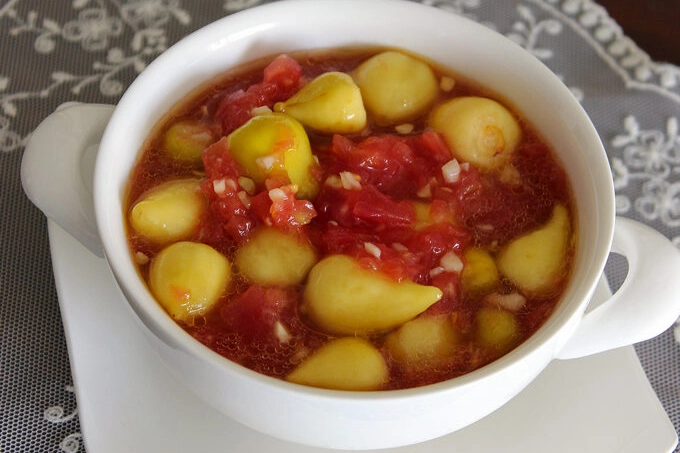 Domateslerin kabuklarını soyup küp küp doğrayın. Sivri biberleri de doğrayın. Sarımsakları soyup iri parçalar halinde doğrayın.