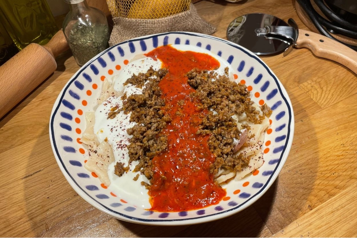 Servis: Haşlanan hamurların üzerine önce kıymalı harcı, sonra yoğurt ve sosu ekleyin.
