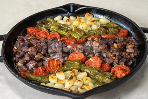 Fırın Kabına Dizme: Fırın kabına öncelikle etleri yerleştirin, ardından domates ve biberleri ekleyin. Son olarak arpacık soğanları ve sarımsakları ilave edin.