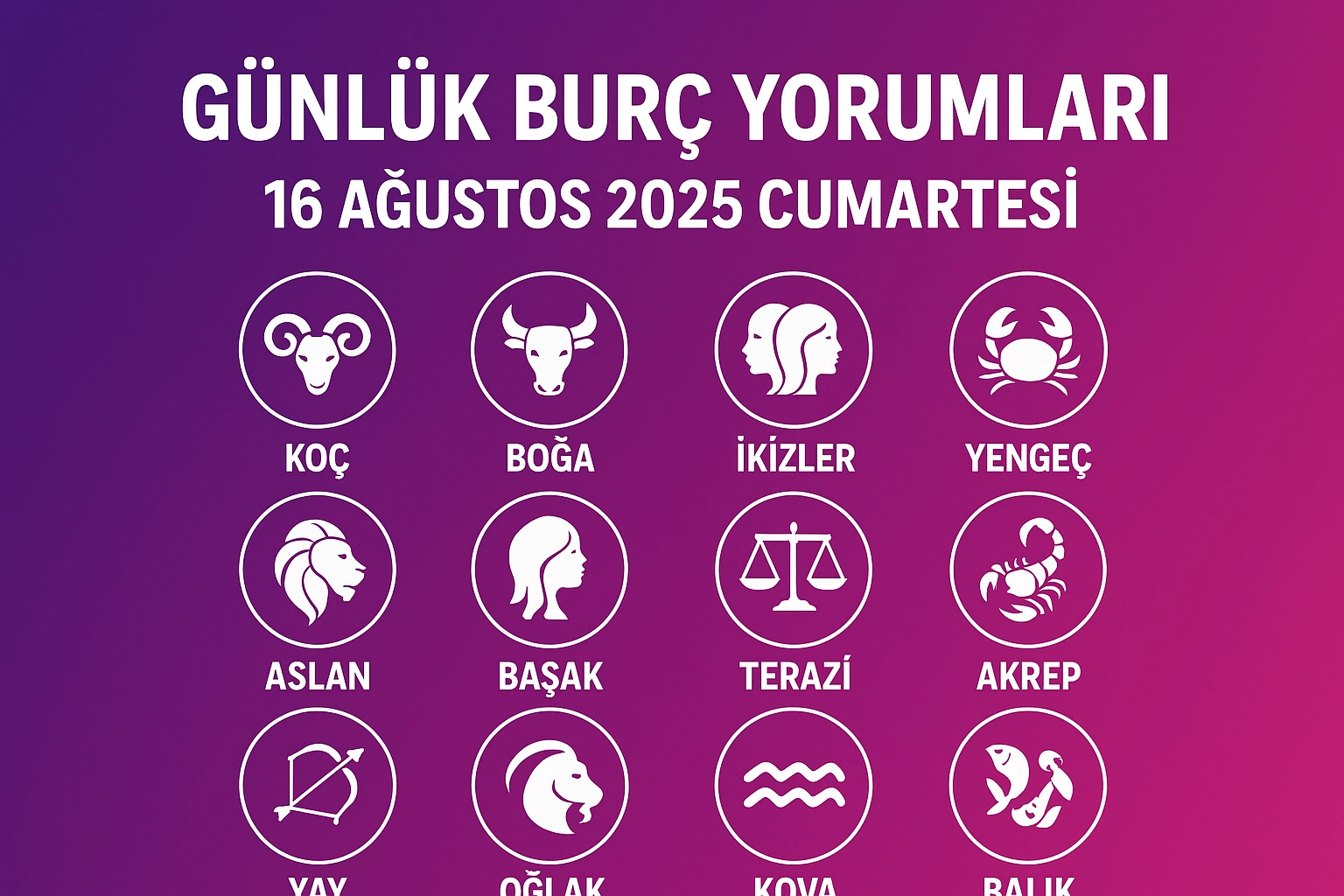 Bugün burçları neler bekliyor? 16 Ağustos 2025 Cumartesi günü Koç, Boğa, İkizler, Yengeç, Aslan, Başak, Terazi, Akrep, Yay, Oğlak, Kova ve Balık burçlarının günlük yorumları nasıl şekillenecek? Aşk, iş, para ve sağlık konularında burçları hangi gelişmeler öne çıkarıyor? Ay’ın Boğa burcundaki seyri ve Venüs’ün etkileri bugün hangi burçların şansını artıracak? İşte 12 burcun günlük astroloji yorumu…