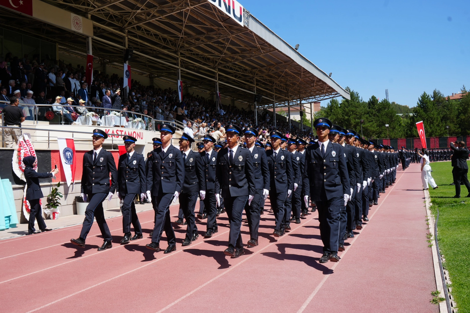 Kastamonu Polis Meslek Yüksekokulu’nun 22. Dönem Mezuniyet Töreni, bu yıl ilk kez Gazi Stadyumu’nda gerçekleştirildi. Tören, mezun öğrencilerin stadyumdaki yerlerini almasıyla başladı. Saygı duruşu ve İstiklal Marşı’nın okunmasının ardından dönem birincisi Mehmet Ali Karadağ, yaş kütüğüne plaketini çakarak töreni resmen başlattı.