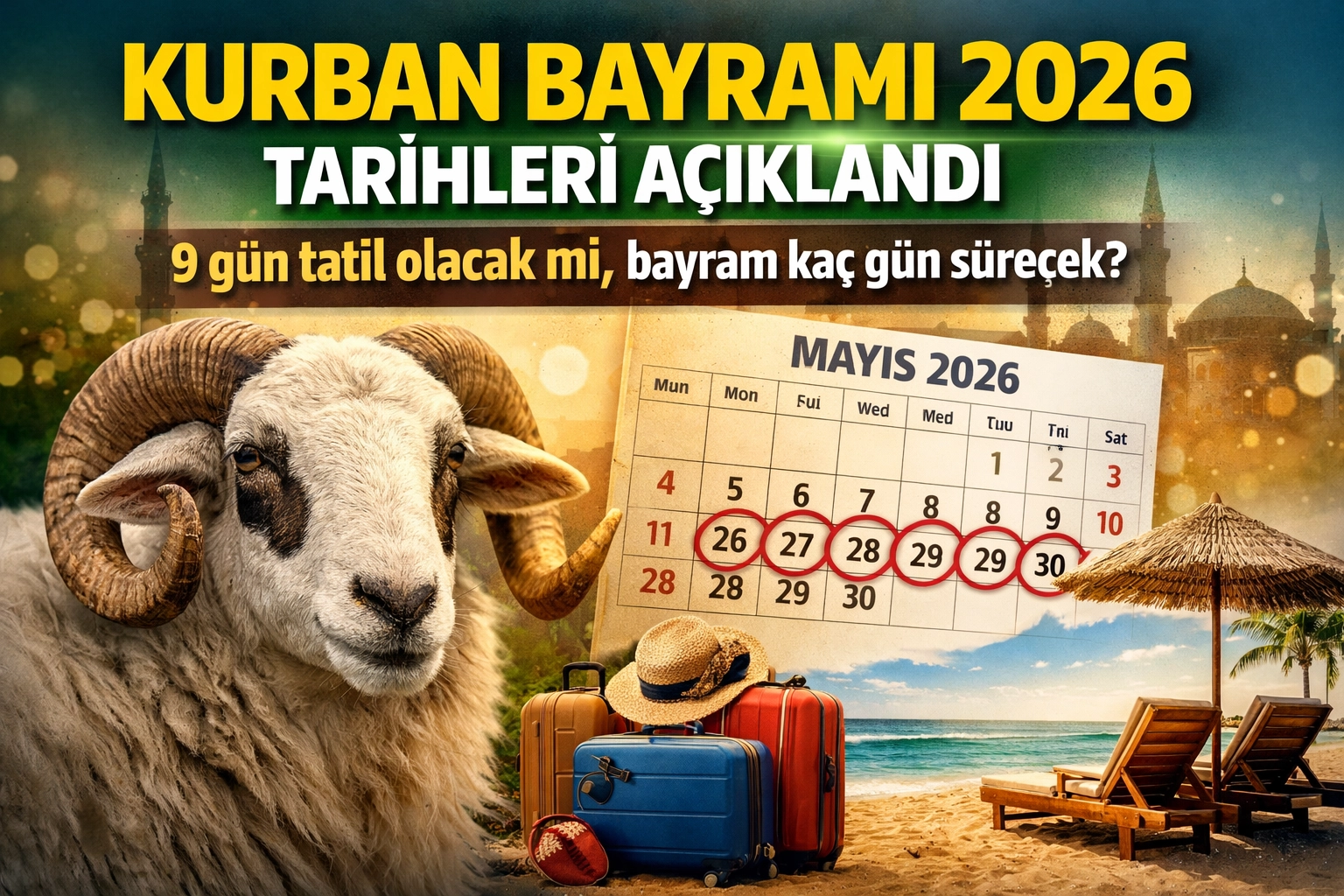 KURBAN BAYRAMI TATİLİ 9 GÜN OLACAK MI?2026 yılında Kurban Bayramı’nın hafta içine denk gelmesi uzun tatil ihtimalini gündeme getirdi. Bayramın ilk üç günü Çarşamba, Perşembe ve Cuma günlerine denk geliyor.