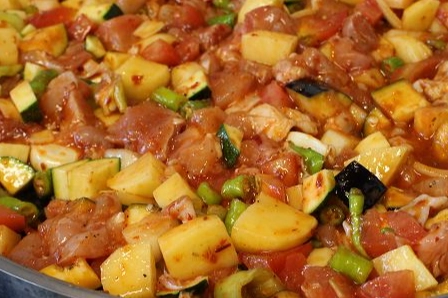 Sebzeleri yıkayın ve iri şekilde doğrayın. Aynı şekilde tavukları da doğrayın. Doğradığınız sebzeleri bir tepsiye yerleştirin.