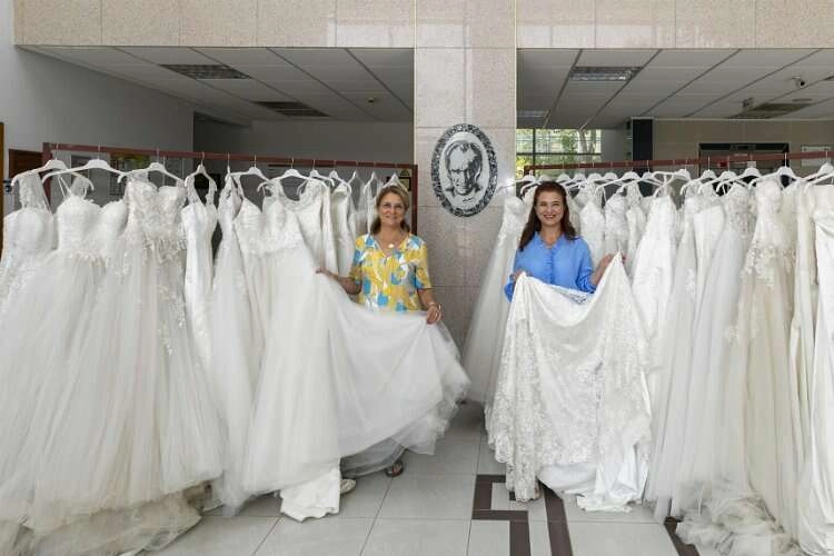 Proje kapsamında bir araya gelen Mersinden Kadın Kooperatifi Başkanı Meral Seçer ile Hatay Büyükşehir Belediye Başkanı Lütfü Savaş’ın eşi Nazan Savaş, bağışlanan gelinlikler dolayısı ile mutluluklarını ifade ettiler.