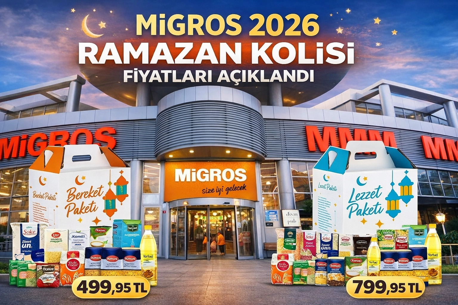 Migros Ramazan Bereket Paketi 499,95 TLMigros’un uygun fiyatlı Ramazan Bereket Paketi 499,95 TL’den satışa sunuldu. Paket içeriğinde temel gıda ürünleri yer alıyor.