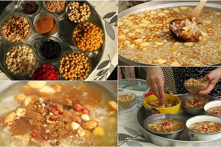 1 çay kaşığı tarçın 2-3 adet karanfil (kaynatılarak suyu alınacak) YAPILIŞI Buğdayı akşamdan ıslatın. Sabah, suyuyla birlikte haşlayın. Nohut ve fasulyeyi de akşamdan ıslatıp ertesi gün ayrı kaplarda haşlayın. Buğday kaynarken üzerine haşlanmış nohut, fasulye, kuru meyveler ve doğranmış elmayı ekleyin. Şeker ve karanfil suyunu da ekleyin. Kıvamına göre su ilavesi yapabilirsiniz. En son kuru inciri ekleyin ki rengi kararmasın. Hafif sulu kıvamdayken ocaktan alın; soğudukça koyulaşacaktır.