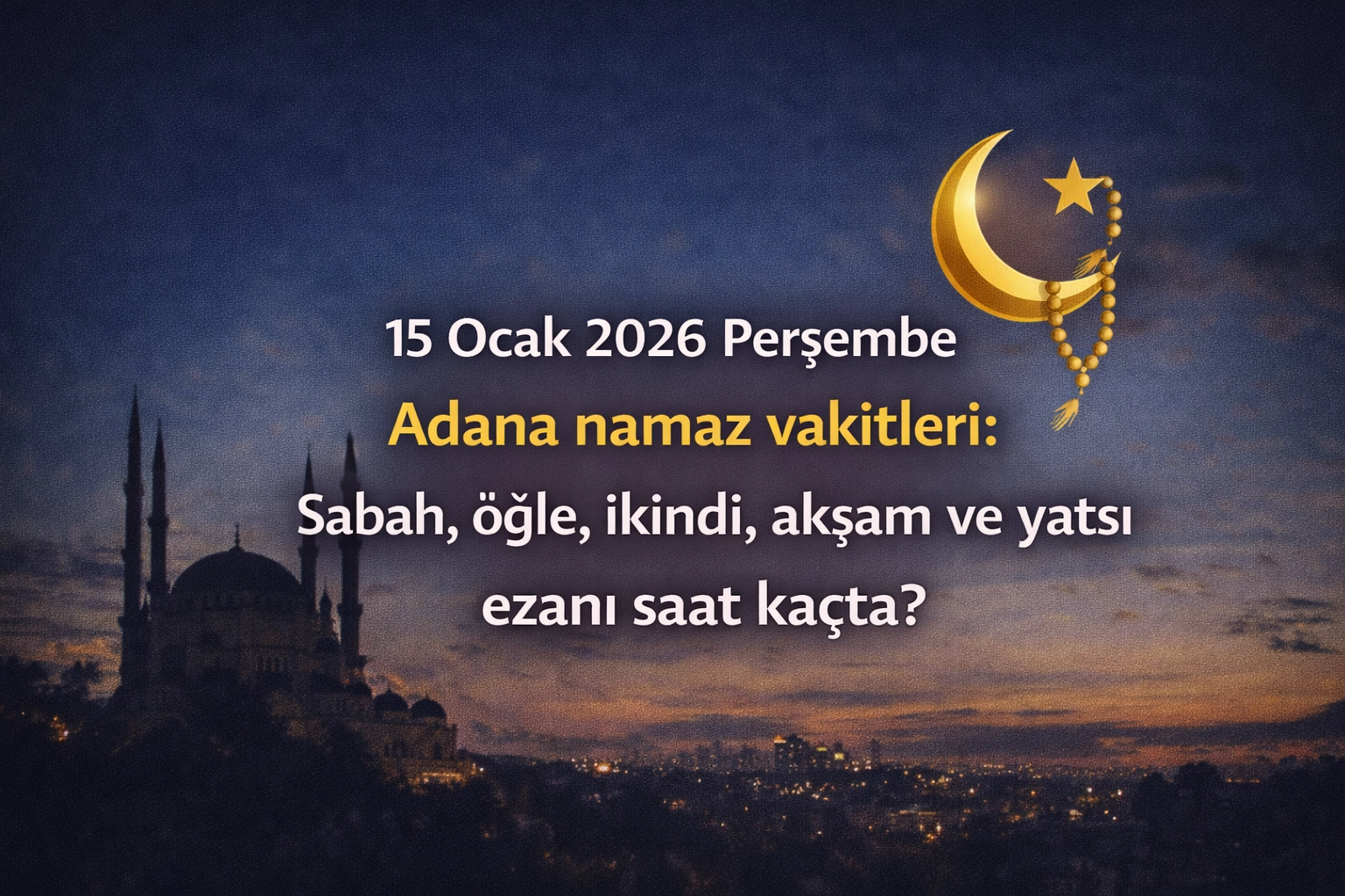 15 OCAK PERŞEMBE ADANA NAMAZ VAKİTLERİAdana'da ikamet edenler için merakla beklenen ezan saatleri, Diyanet'in son verileri ışığında kamuoyu ile paylaşıldı. 15 Ocak günü geçerli olacak imsak, güneş, öğle, ikindi, akşam ve yatsı vakitleri aşağıda sıralandığı şekilde kaydedildi: