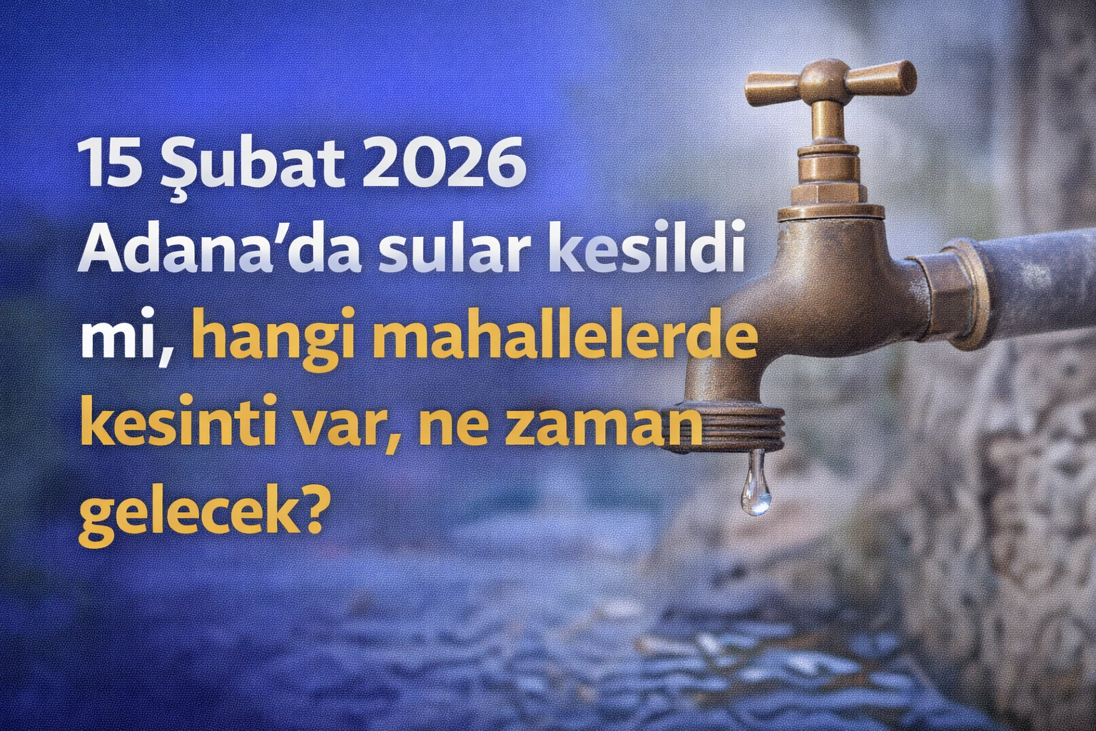 Adana’da 15 Şubat 2026 Pazar günü planlı bakım ve arıza çalışmaları nedeniyle bazı mahallelerde su kesintisi yaşanıyor. Vatandaşlar “Sular ne zaman gelecek, hangi mahallelerde kesinti var?” sorusunun yanıtını araştırırken, ilçe ilçe güncel kesinti listesi açıklandı. İşte Adana su kesintisi detayları…