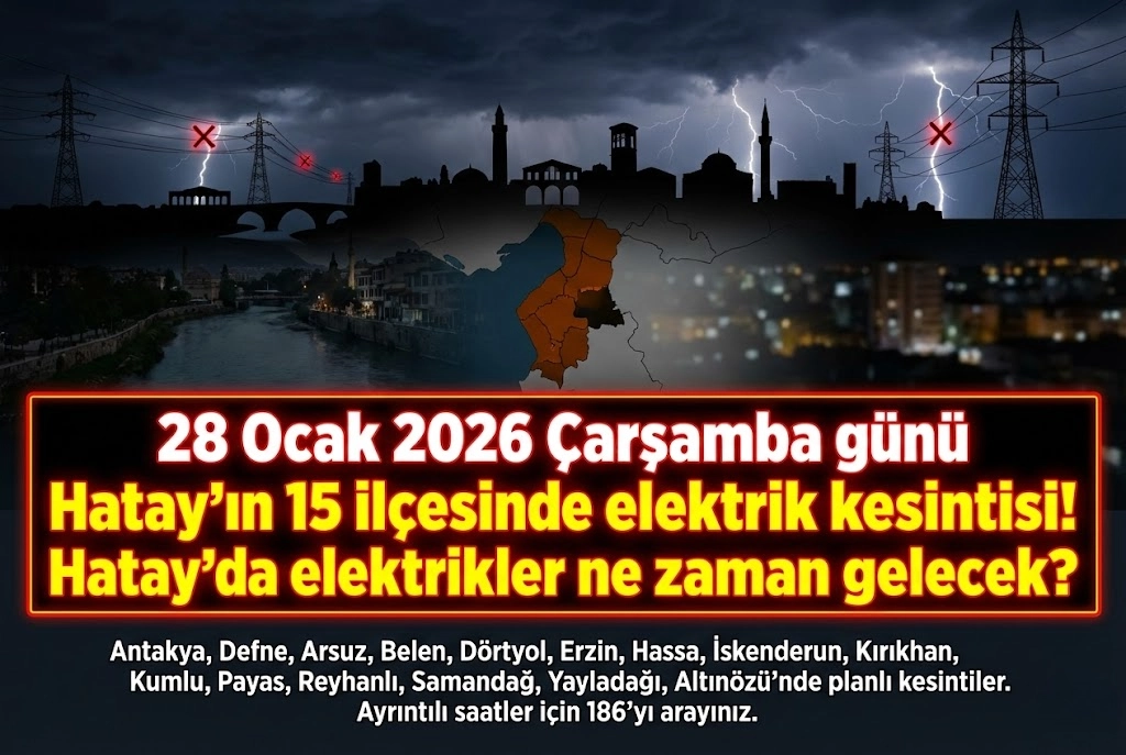 Toroslar Elektrik Dağıtım A.Ş. (Toroslar EDAŞ), Hatay genelinde 28 Ocak 2026 Çarşamba günü planlı elektrik kesintileri uygulanacağını duyurdu. Şirketin açıklamasına göre, bakım ve onarım çalışmaları kapsamında birçok ilçede elektrik geçici olarak kesilecek. Planlı kesintiler, altyapı iyileştirme çalışmalarının güvenli şekilde yürütülmesi amacıyla gerçekleştirilecek. Peki, Hatay'da elektrikler ne zaman gelecek? İşte detaylar... İşte Hatay elektrik kesintisi detayları…