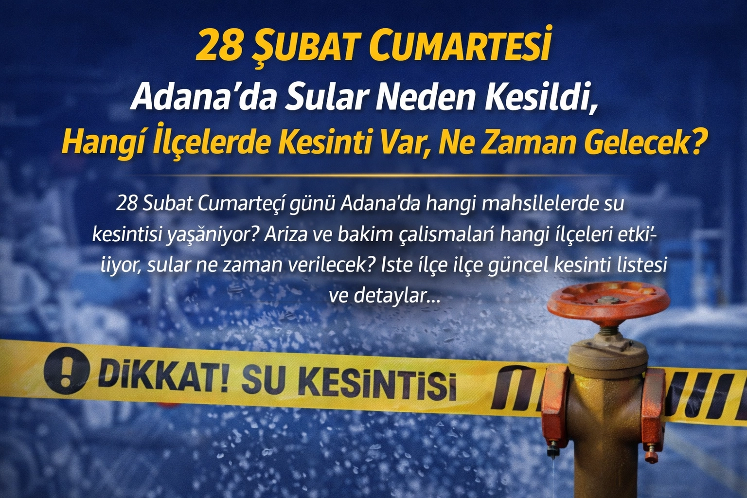 Adana’da 28 Şubat Cumartesi günü Adana su kesintisi yaşanan mahalleler vatandaşlar tarafından merak ediliyor. “Adana’da sular ne zaman gelecek?”, “Hangi ilçelerde su kesintisi var?” soruları sabah saatlerinden itibaren araştırılmaya başlandı. İşte ilçe ilçe güncel arıza ve bakım çalışmaları listesi…