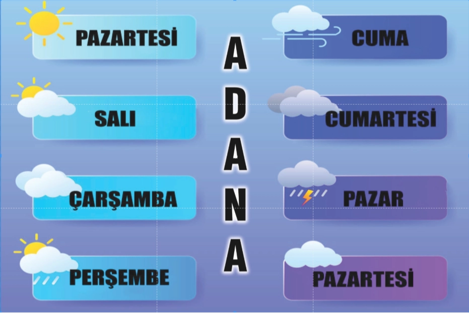 Kozan: Parçalı ve çok bulutlu, sağanak ve gök gürültülü sağanak yağışlı. En yüksek sıcaklık 34°C.