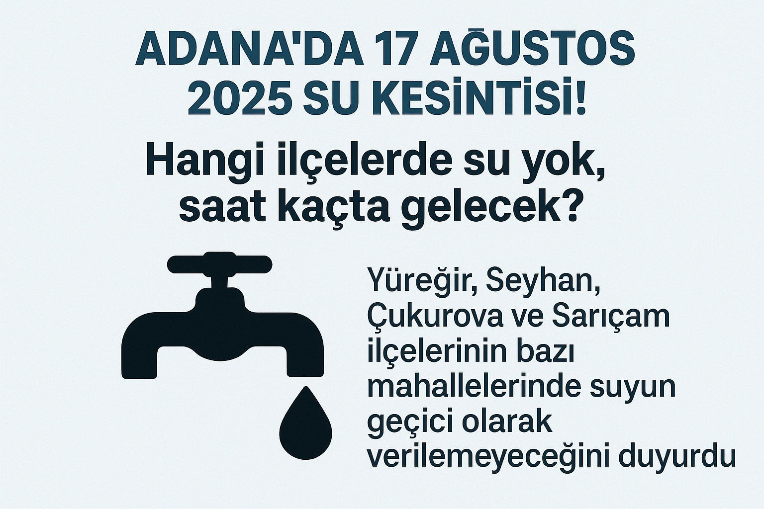 Adana’da su kesintisi ne zaman olacak?Adana Su ve Kanalizasyon İdaresi (ASKİ) tarafından yapılan açıklamaya göre 17 Ağustos 2025 tarihinde bazı bölgelerde planlı su kesintisi uygulanacak. Kesinti saatleri sabah ve akşam olarak değişiklik gösterecek.