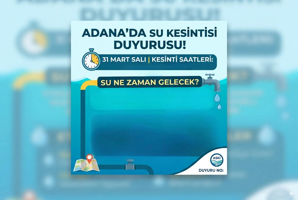 Adana’da 31 Mart Salı günü planlı bakım ve arıza çalışmaları nedeniyle bazı mahallelerde su kesintisi yaşanacak. İşte ilçeler ve etkilenen bölgelerin detaylı listesi.Adana Su ve Kanalizasyon İdaresi (ASKİ) tarafından yapılan açıklamaya göre, 31 Mart 2026 Salı günü bazı ilçelerde su kesintisi planlandı. Kesintiler, bakım ve arıza çalışmalarından dolayı belirli mahalleleri etkiliyor. Adana su kesintisi...