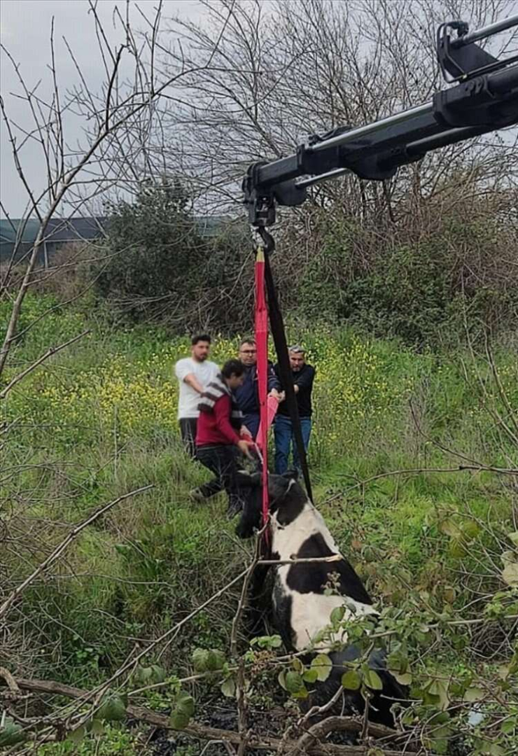 İhbar üzerine olay yerine giden itfaiye ekipleri, balçığa gömülen hayvana ip bağladı. İş makinesi yardımıyla çekilen inek, çalışma sonucu kurtarılarak sahibine teslim edildi.