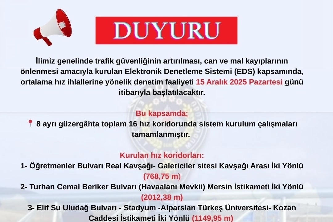 Adana Emniyet Müdürlüğü, şehir genelinde trafik güvenliğini artırmak ve kazaları azaltmak amacıyla Elektronik Denetleme Sistemi (EDS) kapsamında ortalama hız ölçümüne dayalı yeni bir denetim sürecini hayata geçiriyor. Uygulama, 15 Aralık 2025 Pazartesi günü itibarıyla başlatılacak.