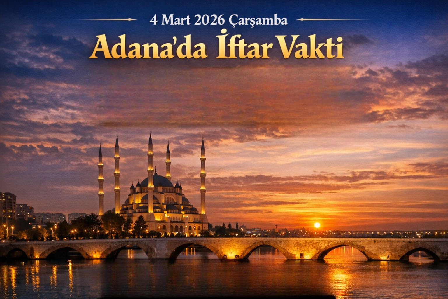 ADANA’DA İFTAR SAAT KAÇTA? 4 MART 2026Diyanet İşleri Başkanlığı tarafından yayımlanan imsakiyeye göre 4 Mart 2026 tarihinde Adana’da iftar vakti 18:42 olarak açıklandı. Akşam ezanının okunmasıyla birlikte vatandaşlar oruçlarını açabilecek.