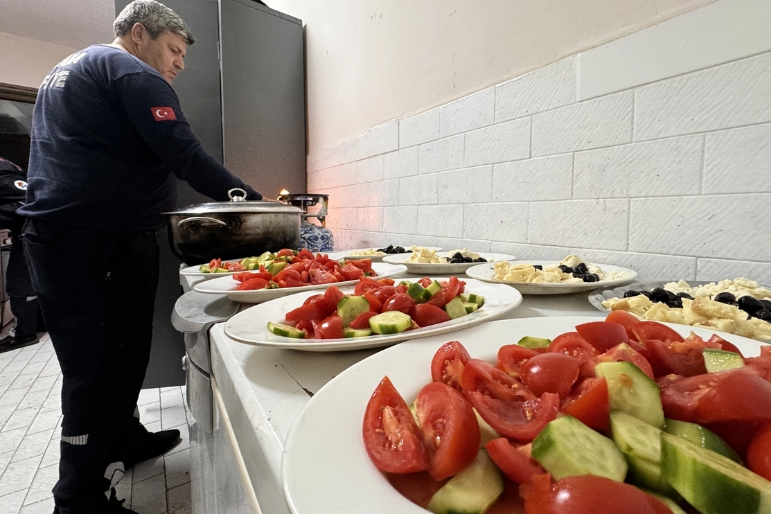 Demlenen çay ve kahvaltılıkları masalara servis eden itfaiye erleri, yatakhanede uyuyan arkadaşlarını kaldırarak sofraya davet etti. Masadaki yerlerini alan itfaiyeciler dua ettikten sonra sahurlarını yaptı.