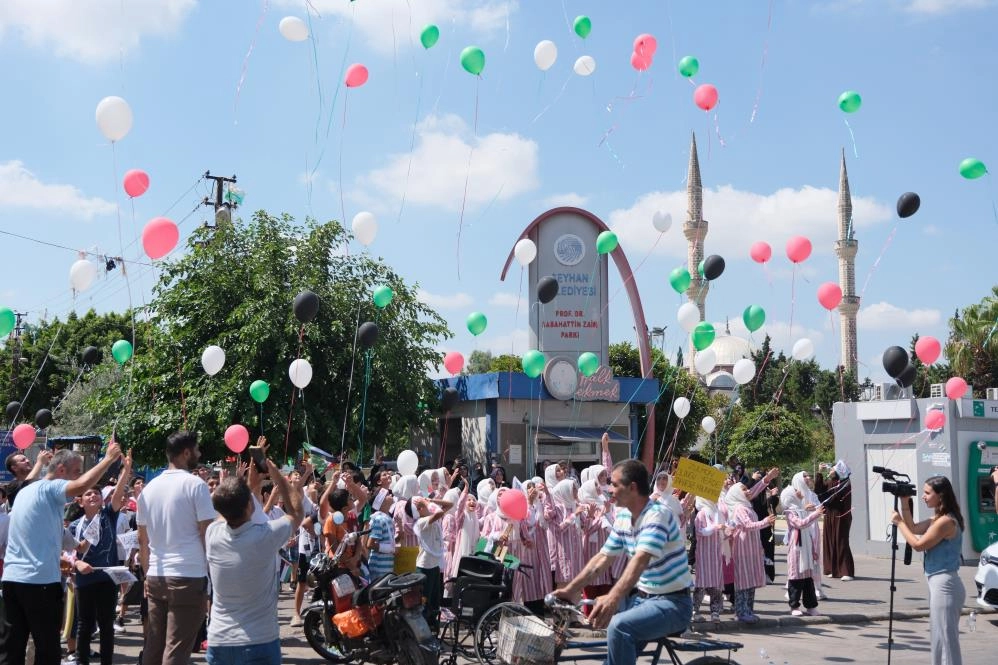 Adana'da Kur'an kurslarında eğitim gören çocuklar Filistin'deki katliama dikkat çekmek için yürüyüş yapıp, hayatını kaybeden akranları için gökyüzüne balon bıraktı.