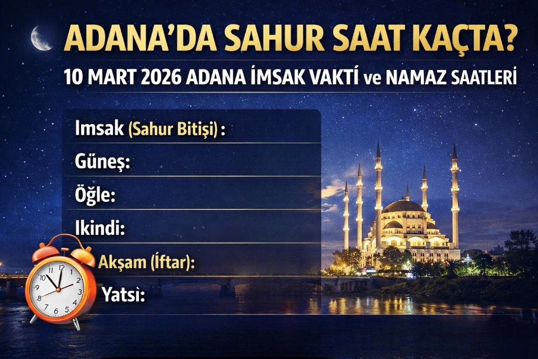ADANA’DA SAHUR SAAT KAÇTA BİTECEK? (10 MART 2026)Diyanet İşleri Başkanlığı tarafından açıklanan namaz vakitlerine göre Adana’da 10 Mart 2026 Salı günü imsak vakti saat 05:31’de olacak.Bu saat itibarıyla sahur vakti sona erecek ve sabah ezanı okunacak. Oruç ibadetini yerine getiren vatandaşların imsak saatinden önce yemek ve içmeyi bırakmaları gerekiyor.