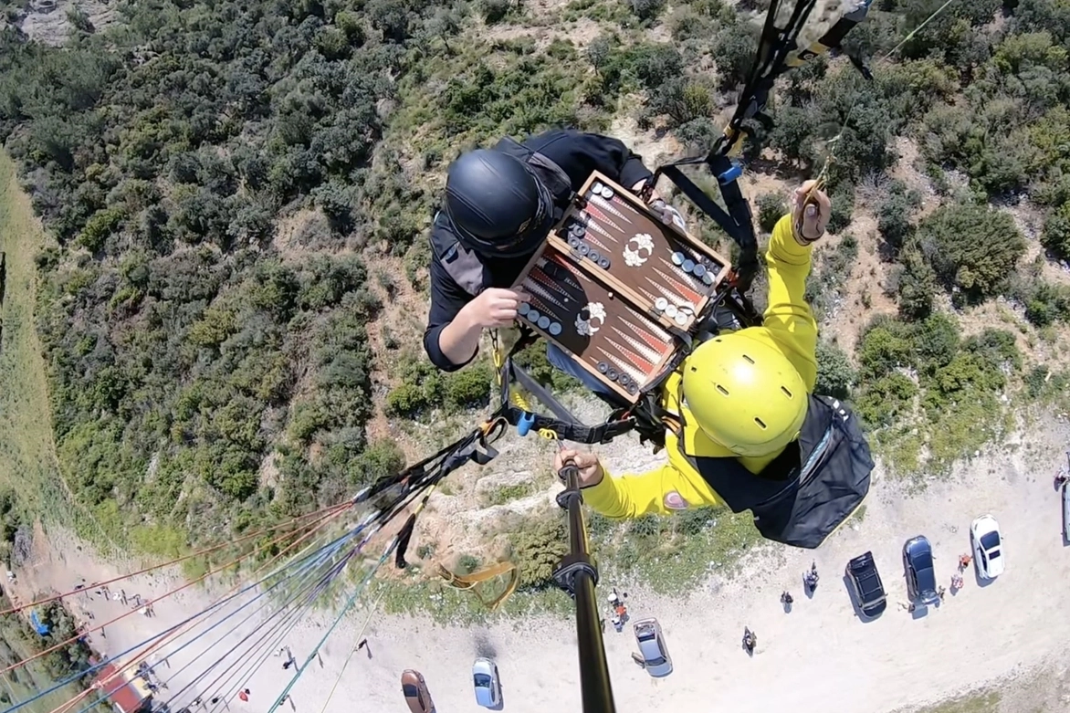 Menekşe Mahallesi'ndeki kalkış alanına giden Mehmet Ağırman ile Furkan Nizamsever, yamaçtan havalanarak paraşütle tandem uçuşu gerçekleştirdi. Yanlarında tavla götüren iki pilot, havalandıktan bir süre sonra gökyüzünde tavla oynadı.Bir süre havada kalan iki pilot, oyunlarının bitmesinin ardından alana iniş yaptı.