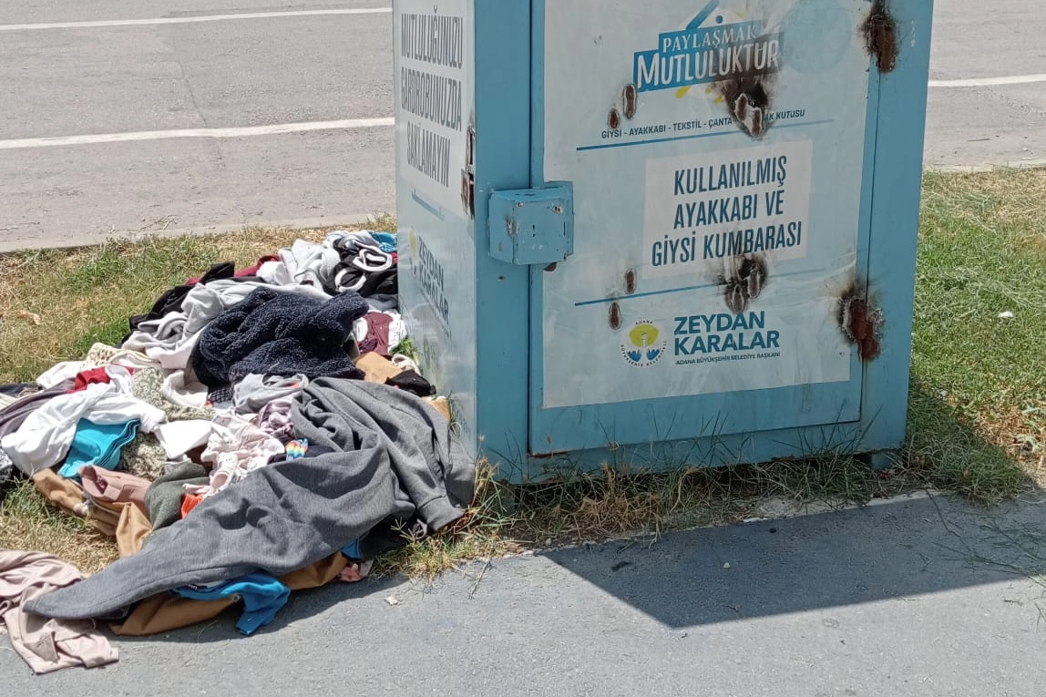 Adana’nın işlek noktalarından Mustafa Kemal Paşa Bulvarı üzerinde bulunan giysi kumbarası, kimliği belirsiz kişiler tarafından kırıldı. Kumbaranın içindeki giysiler dışarı dökülerek çevreye gelişi güzel saçıldı.